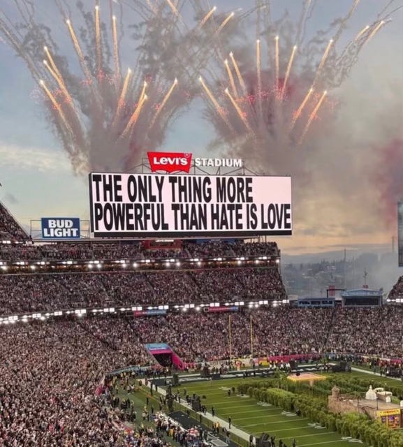 Even though I’d heard the buzz, and knew Bad Bunny’s halftime show was going to be something special, it blew my mind. The usual strutting, humping, glitz, and egomania that predictably characterizes the annual extravaganza was replaced by images of community, solidarity, strength, harmony, and human connection. I don’t understand Spanish, but the message was clear long before it was spelled out on the jumbotron: THE ONLY THING MORE POWERFUL THAN HATE IS LOVE. Fertilized by the manure pile that (un)civil discourse has become, perhaps that message will finally take root.