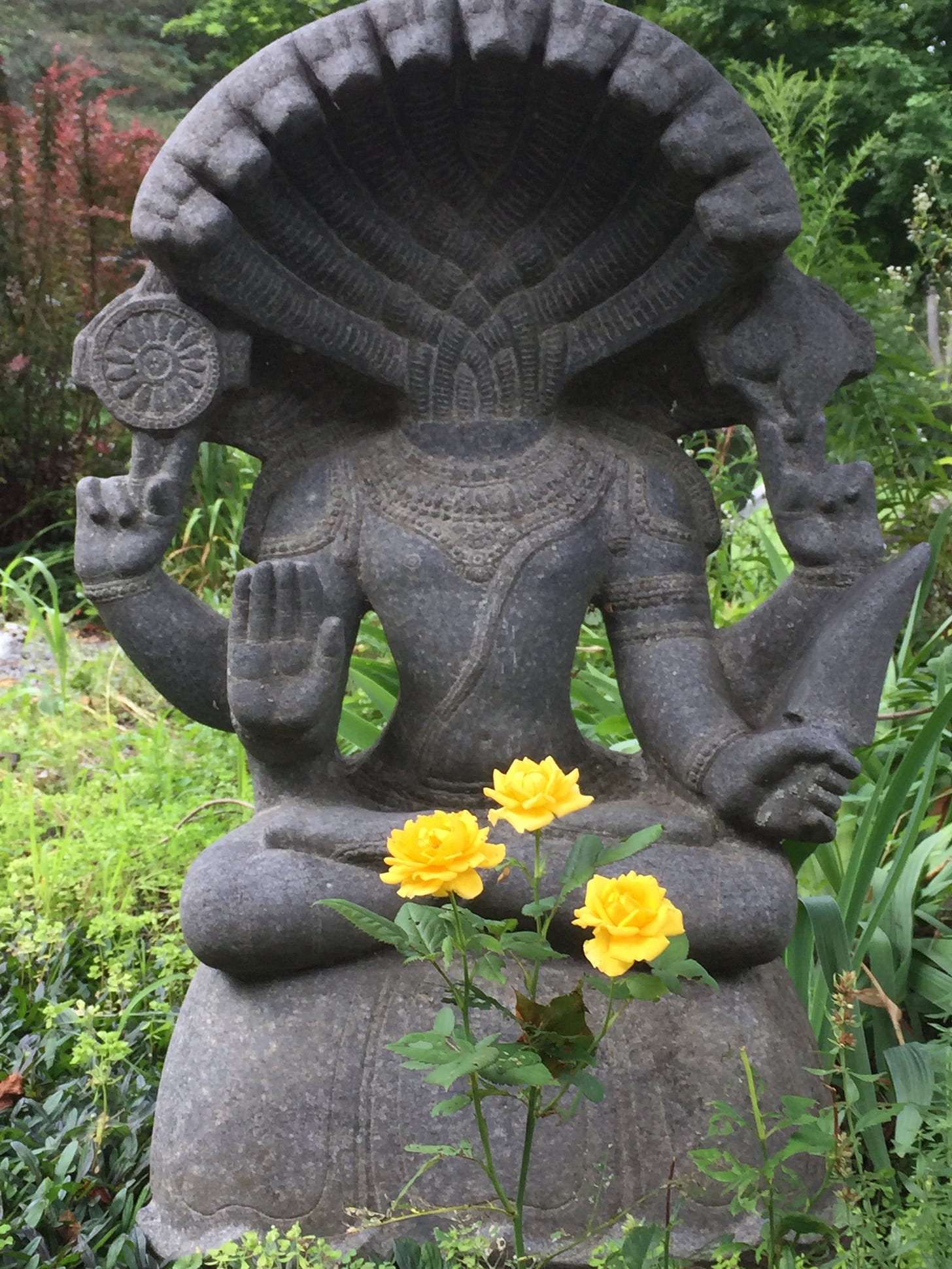 Yoga asks us to be alert and to clean the lenses of perception with daily practice. My snake encounter and recent sad news have me contemplating the snake in metaphor and reality. In India snakes are simultaneously much-feared (which makes sense when you’re dealing with cobras rather than garter snakes!) and considered sacred. Patanjali, the semi-mythical author of the Yoga Sutras is worshipped as an incarnation of the god Vishnu, and is portrayed with a thousand serpent heads. Vishnu himself, the lord of protection, is said to sleep on a serpent, who provides a perfectly supportive and soft bed for the god. Snakes also represent eternity and rebirth. As legless ground-slitherers, snakes are mysterious and fascinating to us. Instead of eyelids, snakes’ eyes are covered with a clear lens. The appearance of unsleeping vigilance is intimidating, but also evocative of the yogi in deep meditation, filled by awareness.