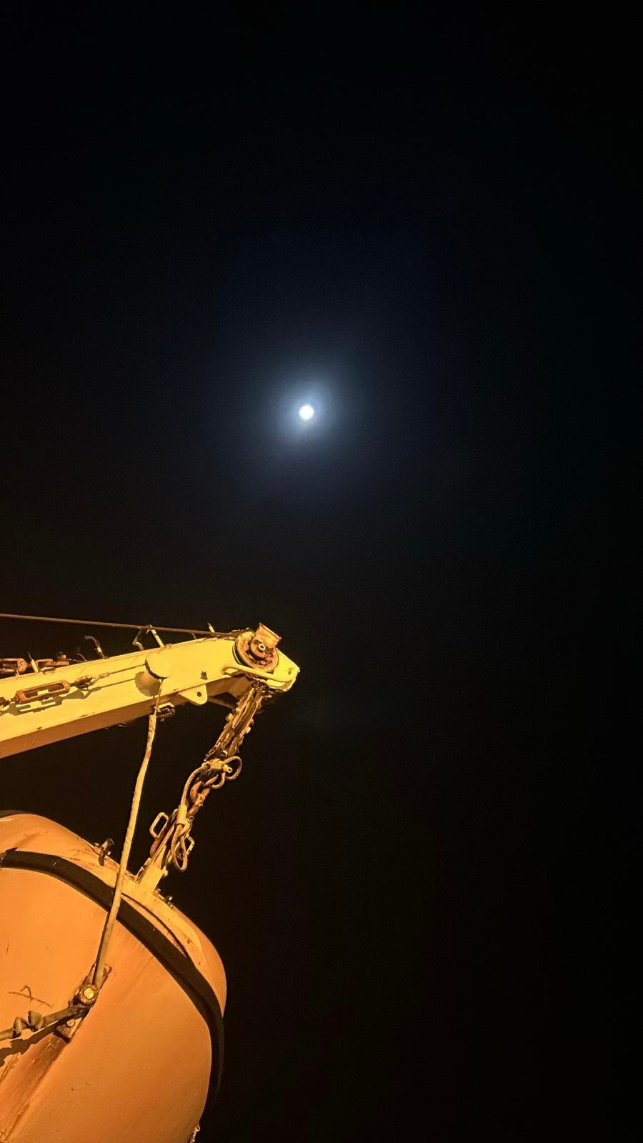 As I was finishing my meditation one recent morning, a text came in from my son. He was on a boat in the Pacific Ocean, sitting on the deck, traveling overnight to a veterinarian who can perform leg surgery on his dog. I tried to conjure the warm, humid air, the sound of the engine, the lapping of water against the hull, the trusting but confused dog at his side. I asked if he could see the moon, and he sent a picture. There it floats, above the ferry’s crane. He rides the planet seventeen hours ahead of me, and it’s hard for me to imagine his reality. But it helps to know he’s looking up at the same moon.